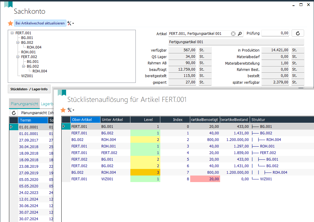 Ohne zusätzliche Naviagation sehen Sie nun in einer übersichtlichen Tabelle auf einen Blick sofort alle Ebenen der Stückliste mit Beständen und Lagerdaten.